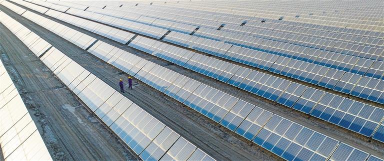 11月10日,新疆巴音郭楞蒙古自治州尉犁海为新能源有限公司20兆瓦光伏电站,运维人员正在巡检。近年来,当地坚持生态优先,走绿色发展之路,充分利用戈壁荒滩发展光伏产业,推动绿色低碳发展。