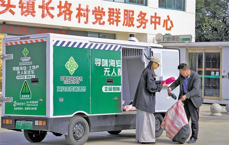 11月10日,在江苏省海安市墩头镇长垎村,村邮驿站工作人员从无人快递配送车上卸下邮件。为应对快递物流高峰,海安市使用无人快递配送车,以科技推动“快递进村”,使服务更高效、更便捷。周 强摄(中经视觉)