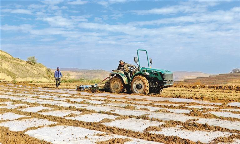 11月11日,甘肃省平凉市静宁县,农机手驾驶农机在田间覆膜保墒。连日来,当地农民抓住降雨较多、土壤墒情较好的有利时机,将覆膜作为旱作农业集水保墒、预防春旱、保产增收的重要举措,为来年春播打下基础。