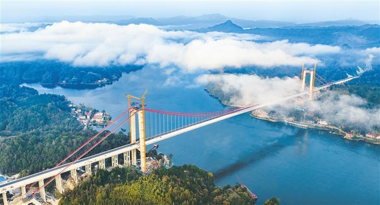 11月13日,湖南省怀化市沅陵县洞庭溪沅水特大桥建设现场,工人正进行桥面沥青混凝土摊铺施工。洞庭溪沅水特大桥是国家重点工程——G59张(家界)官(庄)高速公路关键控制性工程,主桥设计为跨径800米的双塔单跨悬索桥,是湖南省在建跨径最大的悬索桥。
