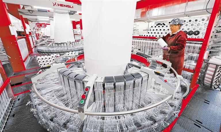 位于山西省运城市平陆县的山西宇泽包装制品股份有限公司生产车间内,工人在赶制集装袋订单产品。