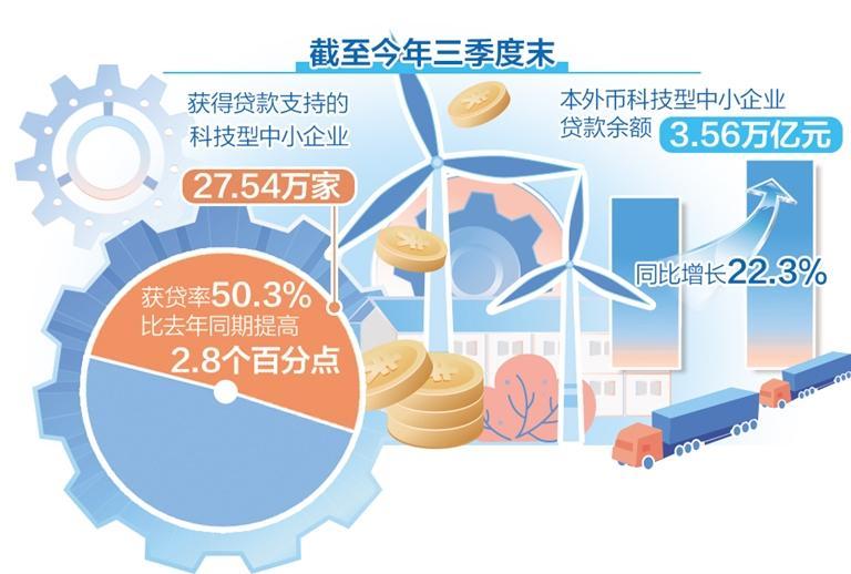 信贷支持科技创新力度持续加大。数据显示,截至今年三季度末,获得贷款支持的科技型中小企业27.54万家,获贷率为50.3%,比去年同期提高2.8个百分点。本外币科技型中小企业贷款余额3.56万亿元,同比增长22.3%,增速比各项贷款高15.8个百分点。
