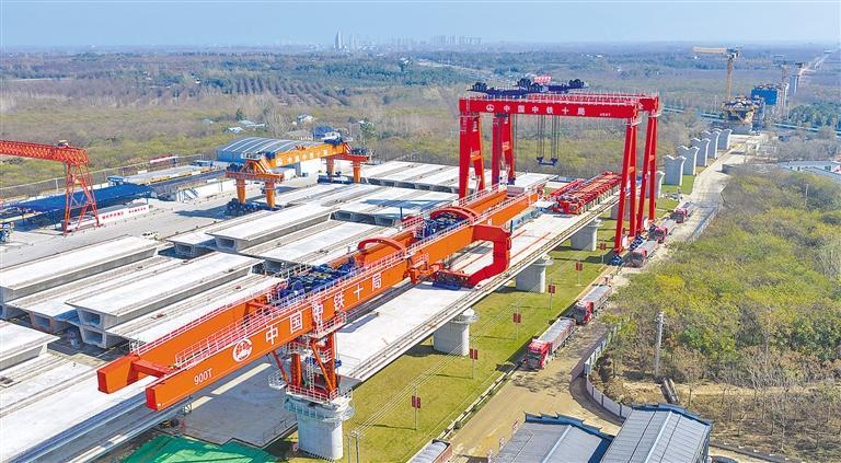 近日,合(肥)武(汉)高铁安徽段全面进入箱梁架设阶段,施工人员奋战在架梁一线,确保重点铁路工程建设进展顺利。这是11月15日拍摄的合武高铁安徽段站前一标肥西制梁场首榀箱梁架设现场(无人机照片)。刘玉才摄(新华社发)