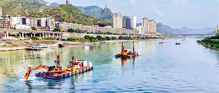 11月15日,贵州省铜仁市沿河县乌江江面,施工船正进行航运扩能作业。乌江航运扩能项目重点整治构皮滩、沙沱及彭水库区变动回水段,包含疏浚、炸礁、清礁、锚地、桥梁改建和航道信息化等工程,计划3年完成。