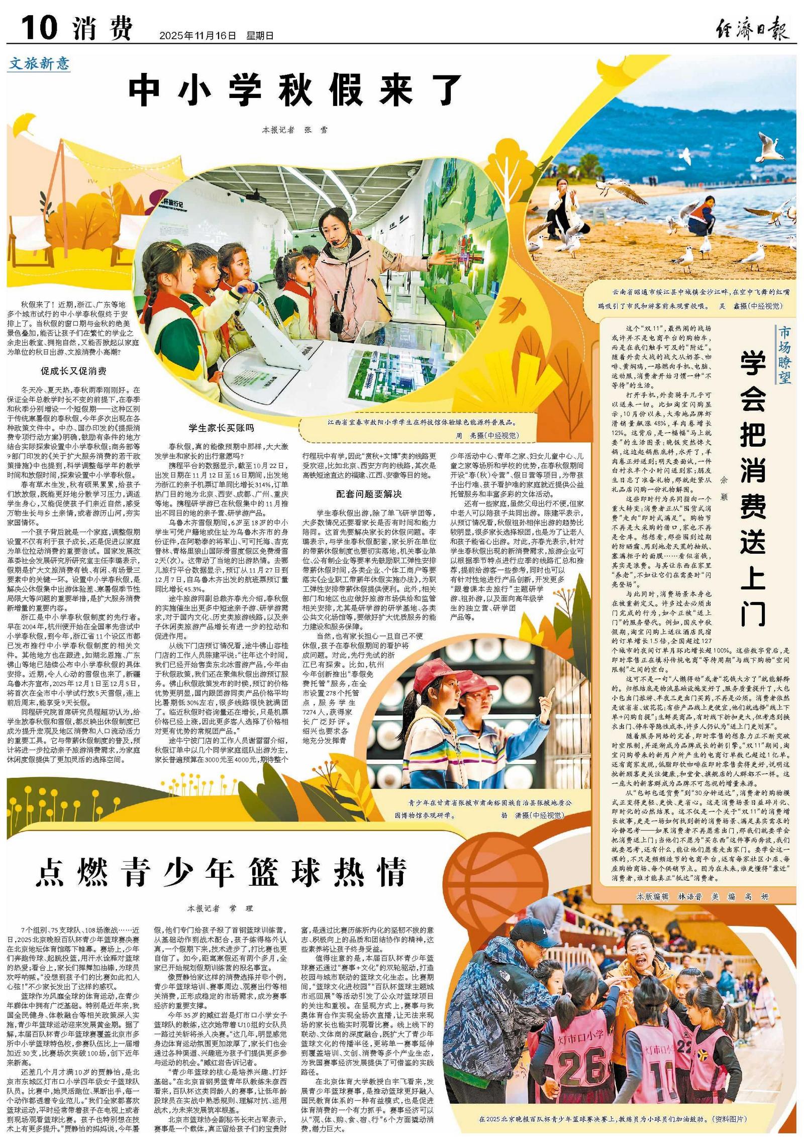 秋假来了!近期,浙江、广东等地多个城市试行的中小学春秋假终于安排上了。当秋假的窗口期与金秋的绝美景色叠加,能否让孩子们在繁忙的学业之余走出教室、拥抱自然,又能否掀起以家庭为单位的秋日出游、文旅消费小高潮?