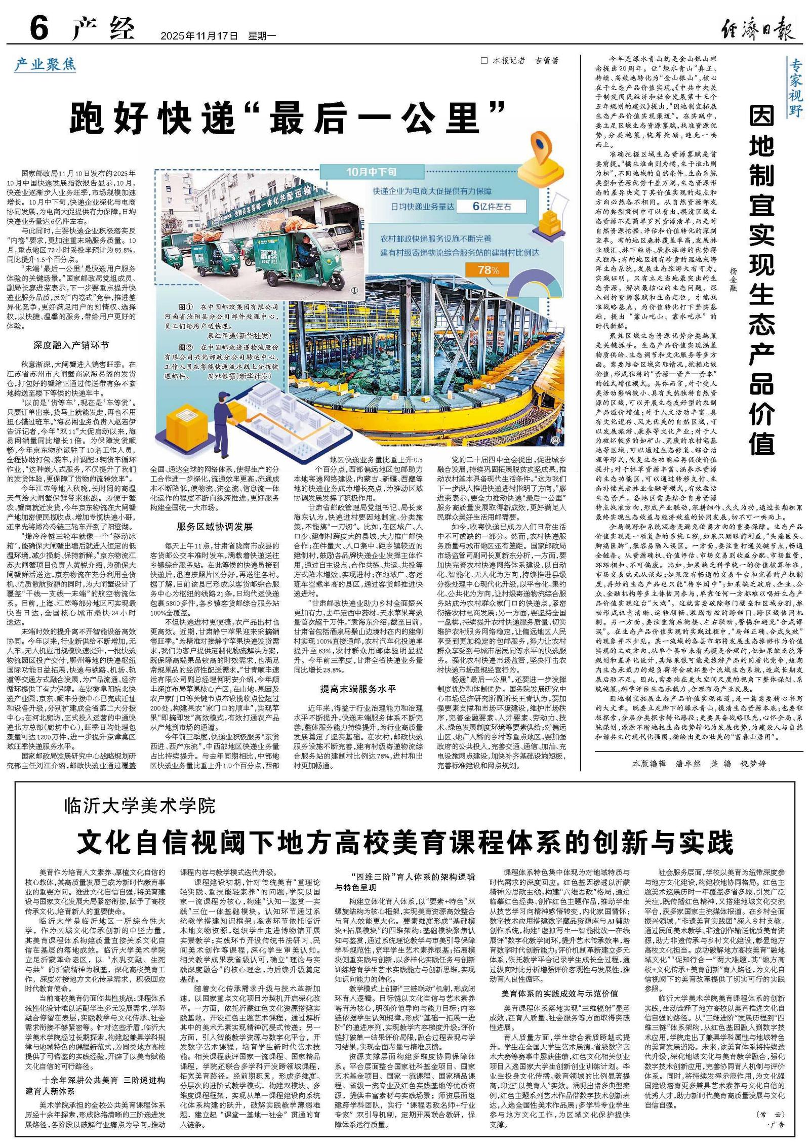末端时效的提升离不开智能设备高效协同。今年以来,行业新供给不断增加,无人车、无人机应用规模快速提升,一批快递物流园区投产交付,鄂州等地的快递枢纽国际功能日益拓展,快递与铁路、机场、轨道等交通方式融合发展,为产品流通、经济循环提供了有力保障。在安徽阜阳皖北快递产业园,京东、顺丰分拨中心已完成迁址和设备升级,分别扩建成全省第二大分拨中心;在河北廊坊,正式投入运营的中通快递北方总部(廊坊中心),旺季日均处理包裹量可达1200万件,进一步提升京津冀区域旺季快递服务水平。