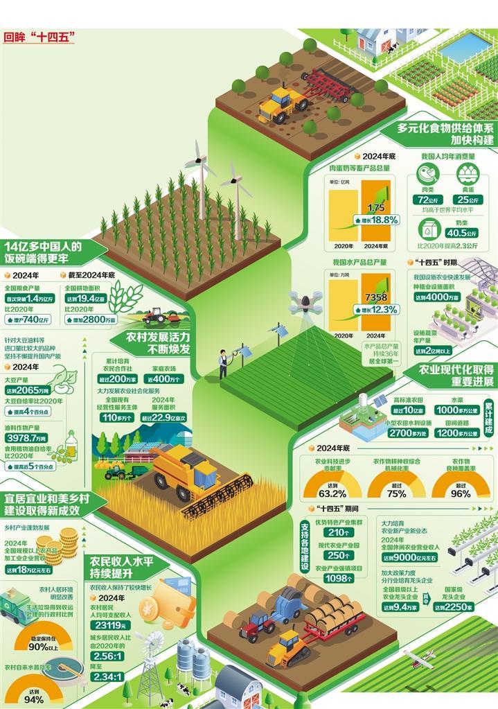 “十四五”期间,我国粮食产量稳定在1.3万亿斤以上,2024年首次突破1.4万亿斤。在大食物观的引领下,谷物、肉类、花生、蔬菜、茶叶、水果等产量位居世界首位。谷物基本自给、口粮绝对安全,为我们有效应对各种风险挑战增加了信心、添足了底气。