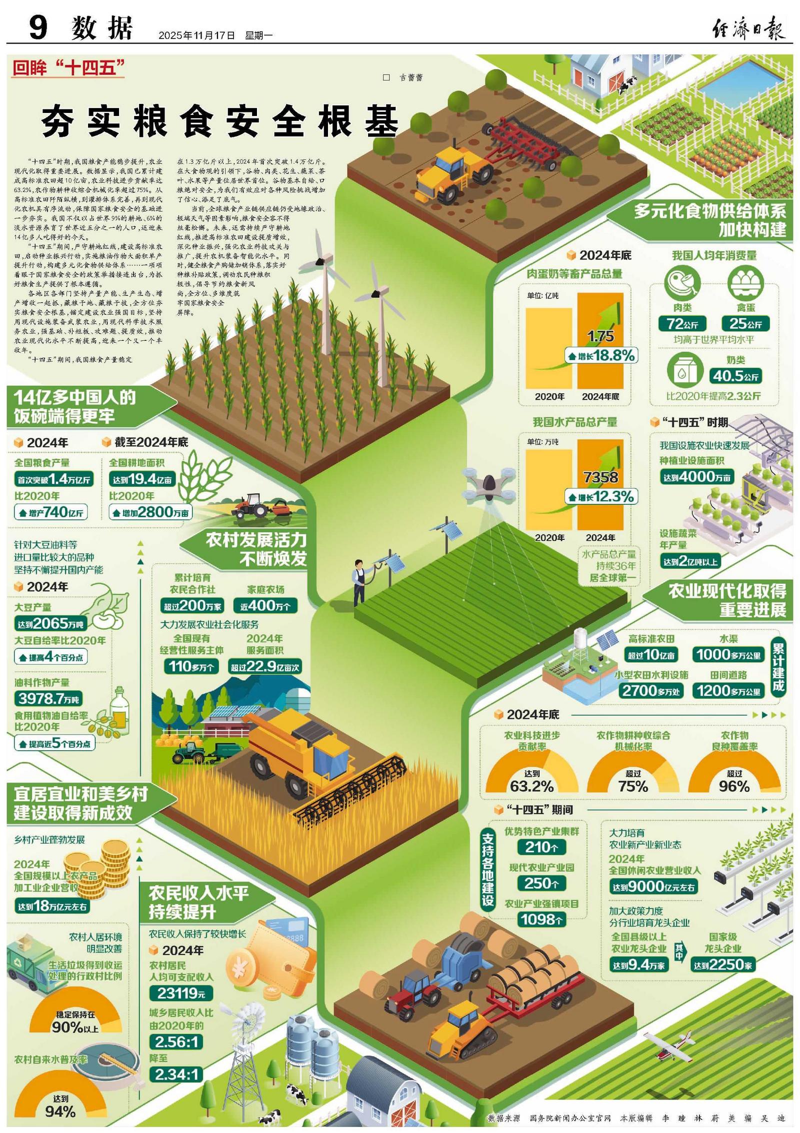 “十四五”时期,我国粮食产能稳步提升,农业现代化取得重要进展。数据显示,我国已累计建成高标准农田超10亿亩,农业科技进步贡献率达63.2%,农作物耕种收综合机械化率超过75%。从高标准农田阡陌纵横,到灌排体系完善,再到现代化农机具有序流动,保障国家粮食安全的基础进一步夯实。我国不仅以占世界9%的耕地、6%的淡水资源养育了世界近五分之一的人口,还迎来14亿多人吃得好的今天。