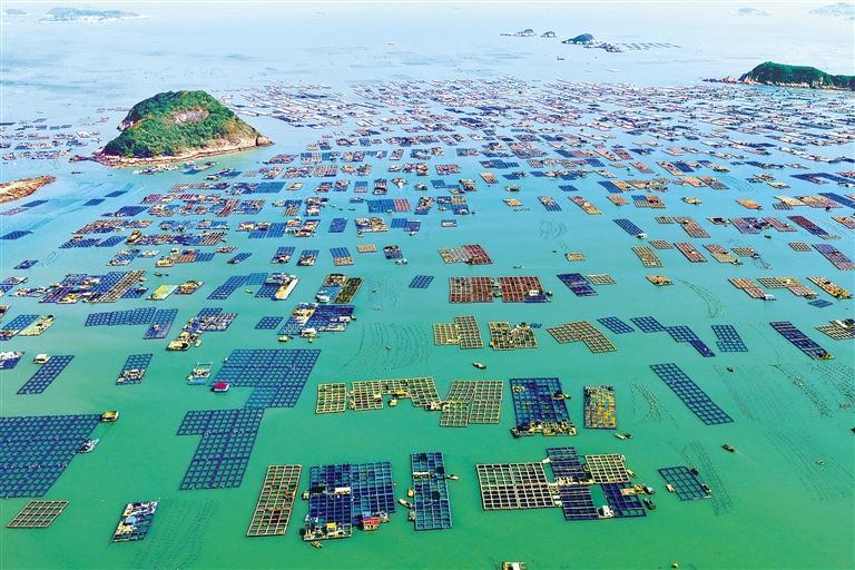 11月15日,福建省福州市连江县海域,工人在养殖区进行冬管作业,勾勒出一幅生机勃勃的海上耕耘画卷。近年来,当地不断推动养殖装备升级,海洋经济取得长足发展。王旺旺摄(中经视觉)