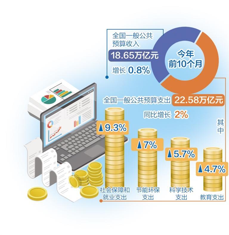 在支出方面,各级财政部门落实更加积极的财政政策,加大支出强度,优化支出结构,持续加强对重点领域的支出保障。统计显示,前10个月,全国一般公共预算支出22.58万亿元,同比增长2%,其中,社会保障和就业支出增长9.3%,教育支出增长4.7%,卫生健康支出增长2.4%,科学技术支出增长5.7%,节能环保支出增长7%,文化旅游体育与传媒支出增长2.5%。