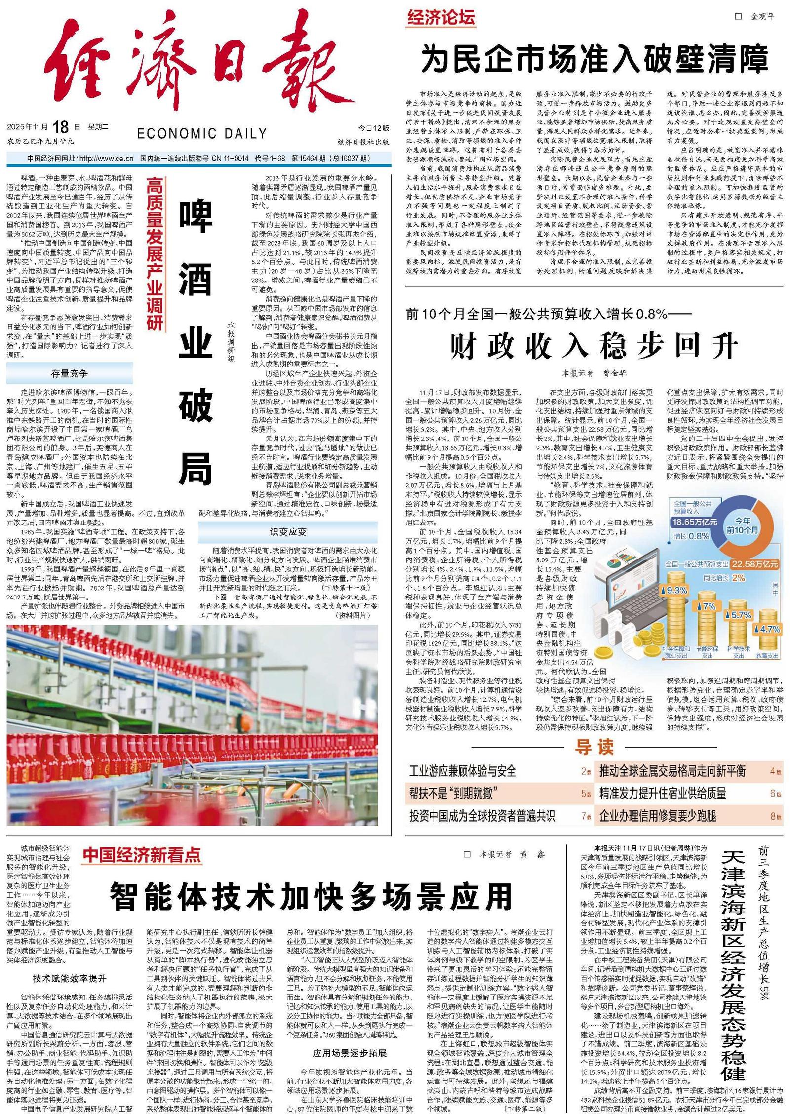 一般公共预算收入由税收收入和非税收入组成。10月份,全国税收收入2.07万亿元,增长8.6%,增幅与上月基本持平。“税收收入持续较快增长,显示经济稳中有进对税源形成了有力支撑。”北京国家会计学院副院长、教授李旭红表示。