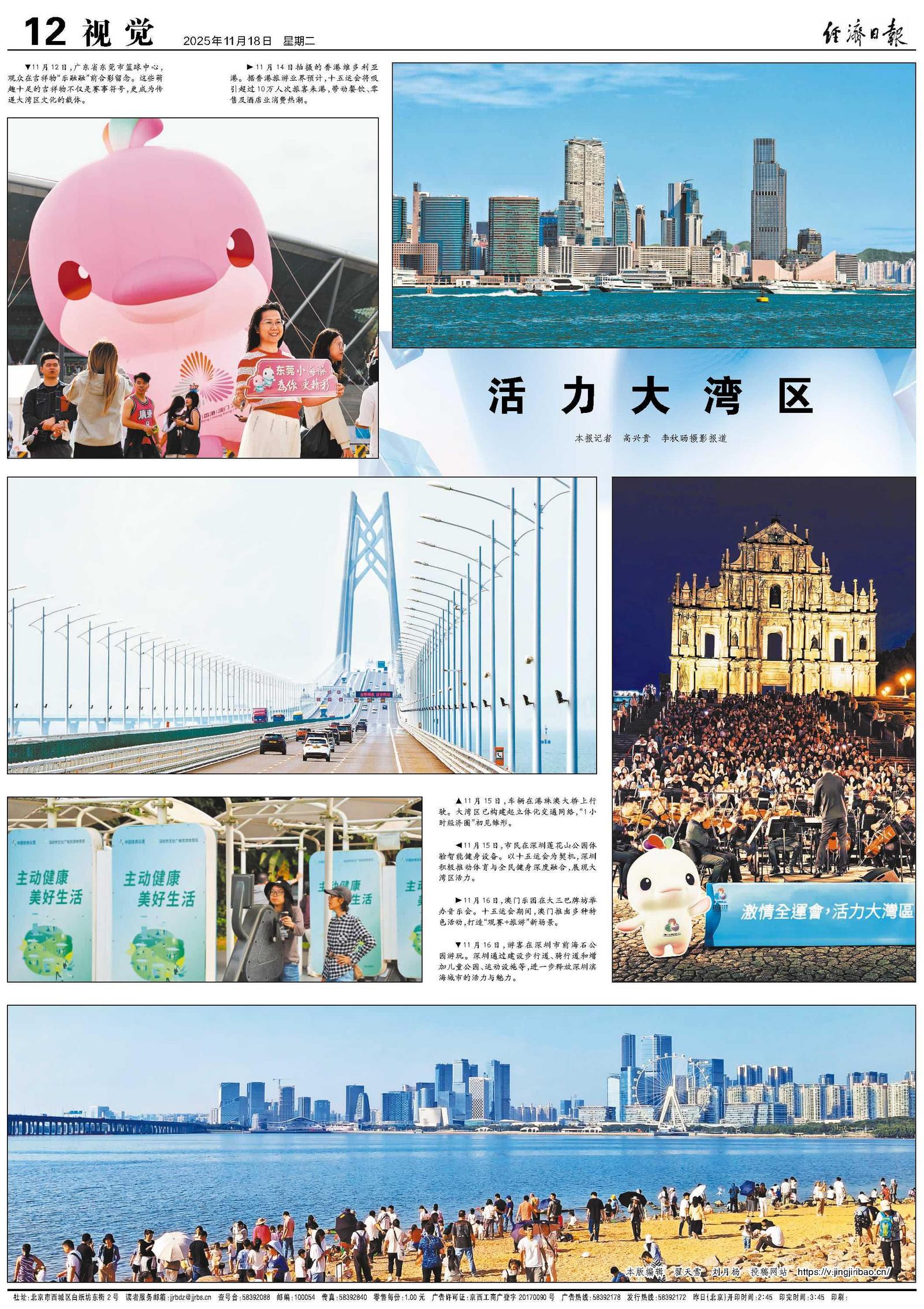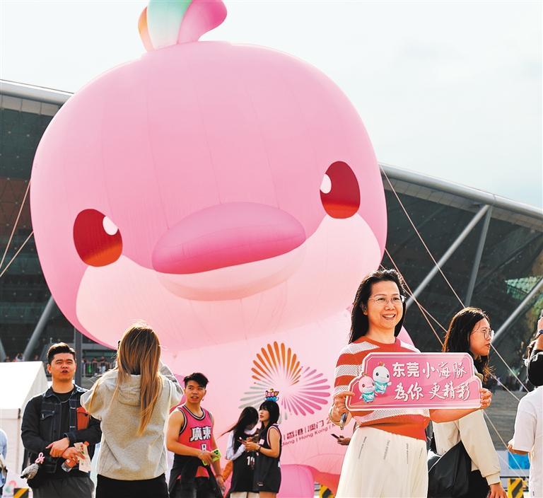 11月12日,广东省东莞市篮球中心,观众在吉祥物“乐融融”前合影留念。这些萌趣十足的吉祥物不仅是赛事符号,更成为传递大湾区文化的载体。