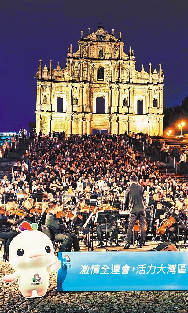 11月16日,澳门乐团在大三巴牌坊举办音乐会。十五运会期间,澳门推出多种特色活动,打造“观赛+旅游”新场景。