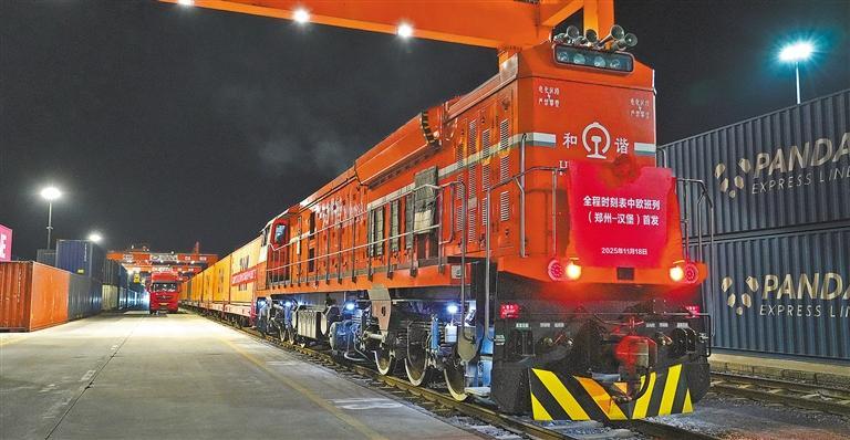 11月18日凌晨4点30分,X8003次中欧班列从国铁集团郑州局圃田站驶出,标志着全程时刻表中欧班列(郑州—汉堡)首列正式开行。该班列计划每周开行一列,将更好满足沿线客户的运输需求。张瀚澜摄(中经视觉)