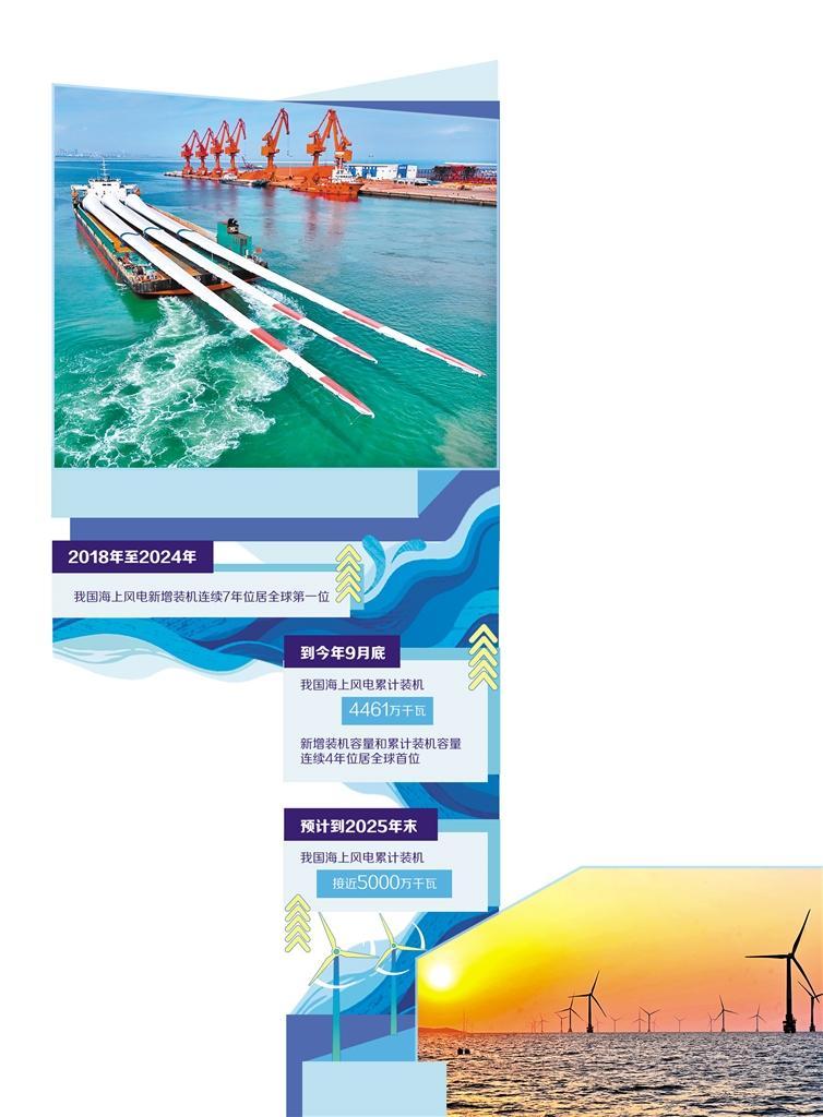 装机规模稳居全球首位。2018年至2024年,我国海上风电新增装机连续7年居全球第一位。“到今年9月底,我国海上风电累计装机达4461万千瓦,新增装机容量和累计装机容量已连续4年居全球首位,超过全球海上风电累计装机的一半。我国海上风电步入发展快车道,未来前景广阔。”国家能源局监管总监黄学农说。