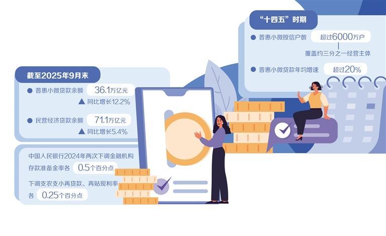 小微企业是我国经济体系的重要组成部分,也是我国金融服务体系的薄弱环节,长期存在“融资难、融资贵”等问题。近年来,金融管理部门不断优化和丰富结构性货币政策,引导银行机构围绕支持民营小微经济的重点领域强化信贷投放,进一步提升普惠金融服务的适配性和精准性。数据显示,截至2025年9月末,普惠小微贷款余额36.1万亿元,同比增长12.2%;民营经济贷款余额71.1万亿元,同比增长5.4%。三季度以来,货币政策工具不断强化对普惠小微贷款的支持,小微企业融资协调工作机制持续发挥作用,引导金融资源流向民营小微企业,在银行业科技赋能、数据风控、产品创新加持下,最终实现普惠小微贷款量增价降、服务提质。