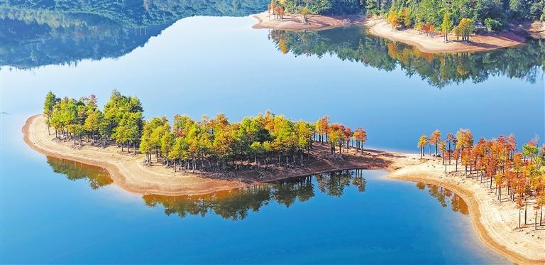 11月24日,浙江省台州市仙居县横溪镇郑桥水库一片水杉黄红相间,与湛蓝的湖面相映成景。近年来,当地推行河(湖、库)长制,深化水库生态环境治理,守护饮用水源安全。王华斌摄(中经视觉)