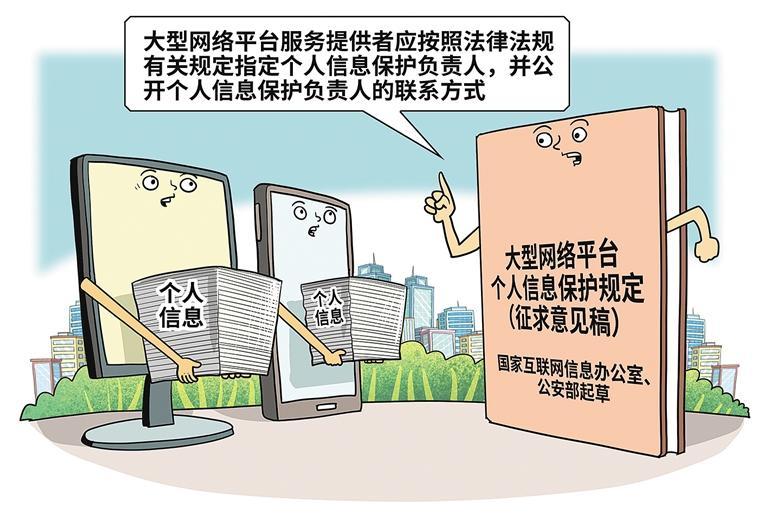 为规范大型网络平台个人信息处理活动,保护个人信息合法权益,促进平台经济健康发展,国家互联网信息办公室、公安部起草了《大型网络平台个人信息保护规定(征求意见稿)》,于近日向社会公开征求意见。根据征求意见稿,大型网络平台服务提供者应按照法律法规有关规定指定个人信息保护负责人,并公开个人信息保护负责人的联系方式。为确保新规落地见效,还需各方协同推进。相关部门应根据反馈情况完善征求意见稿,细化大型平台认定标准与合规要求;平台企业应设立符合条件的个人信息保护负责人,建立健全内部合规体系。此外,广大用户可通过平台提供的专门渠道行使查阅、更正、删除等权利,积极参与社会监督,对违规行为进行投诉举报。(时 锋)