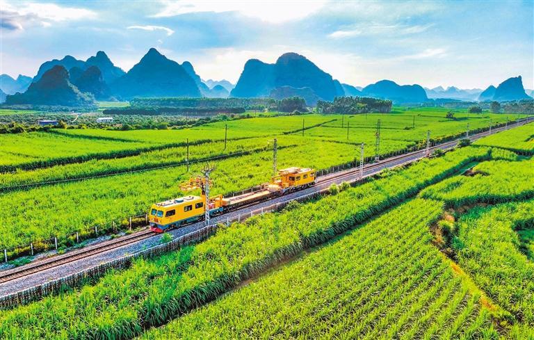 9月28日,铁路工人在黔桂铁路宜州站至油路站区段检修接触网设备,确保运行畅通。