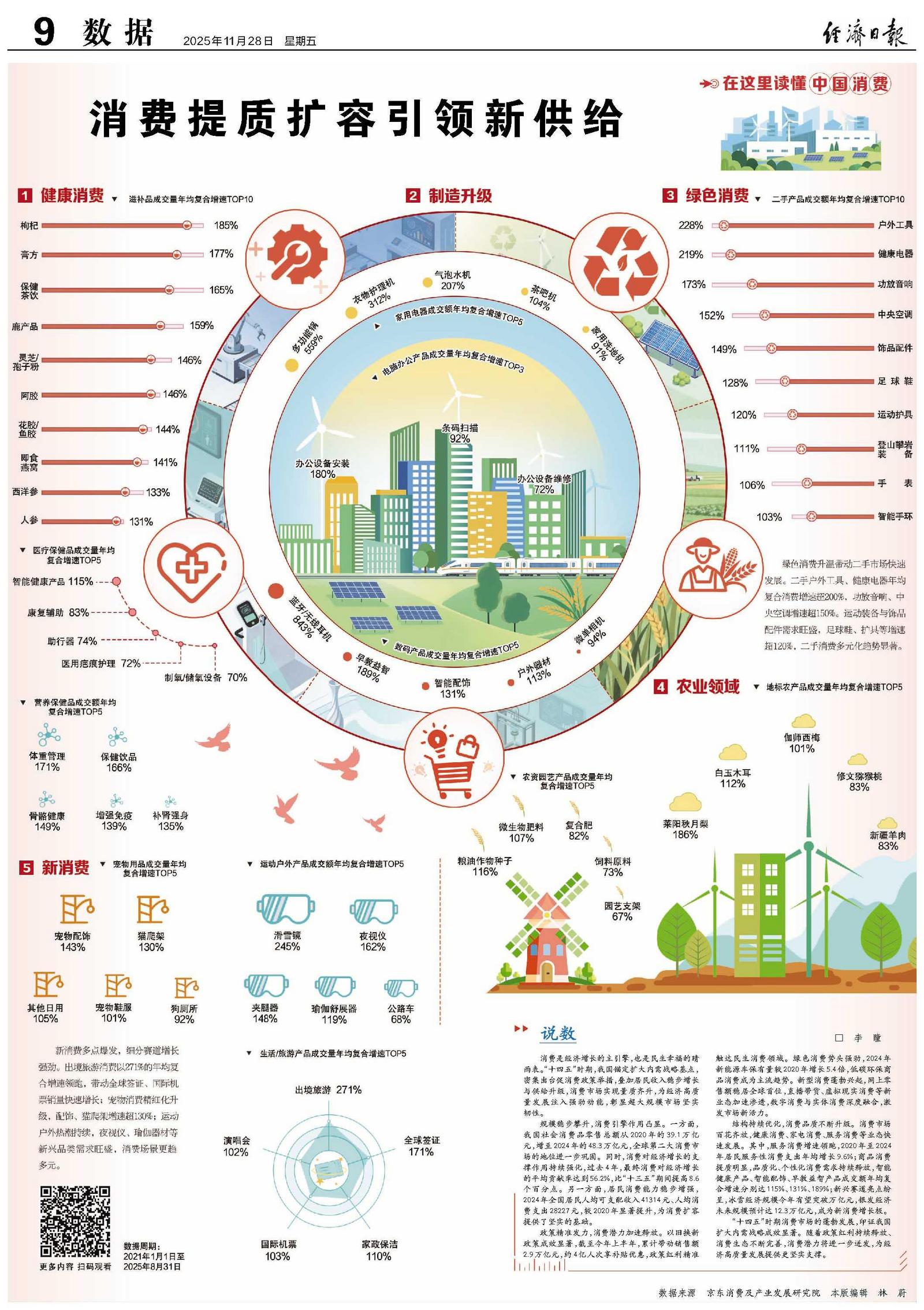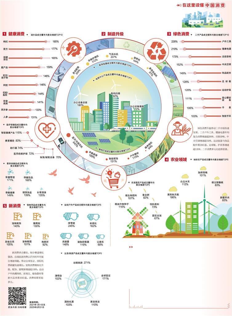 结构持续优化,消费品质不断升级。消费市场百花齐放,健康消费、家电消费、服务消费等业态快速发展。其中,服务消费增速领跑,2020年至2024年居民服务性消费支出年均增长9.6%;商品消费提质明显,品质化、个性化消费需求持续释放,智能健康产品、智能配饰、早教益智产品成交额年均复合增速分别达115%、131%、189%;新兴赛道亮点纷呈,冰雪经济规模今年有望突破万亿元,银发经济未来规模预计达12.3万亿元,成为新消费增长极。