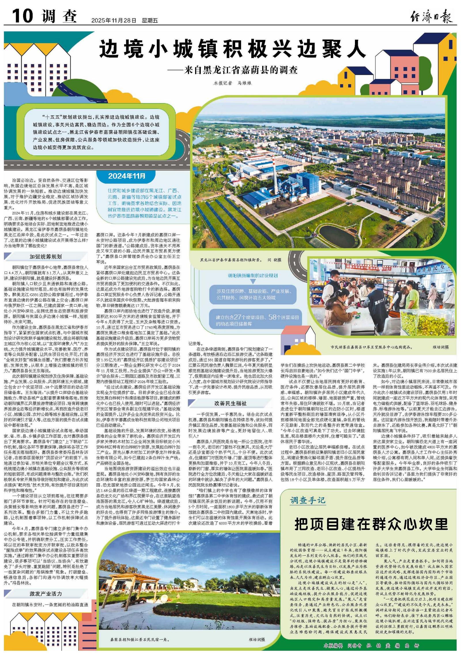 作为建设主体,嘉荫县在黑龙江省和伊春市指导下,紧紧抓住国家试点机遇,与中国城市规划设计研究院联手编制建设规划,提出将朝阳镇主城区作为核心区域,以“宜居环境聚人气”为主线,大力提升城镇建设水平,完善教育、医疗、养老等公共服务配套,让民生项目处处开花,打造“全域友好型”城镇生活圈。“我们要着力补齐短板、发挥优势,从根本上增强边境城镇的吸引力。”嘉荫县县长王东海说。
