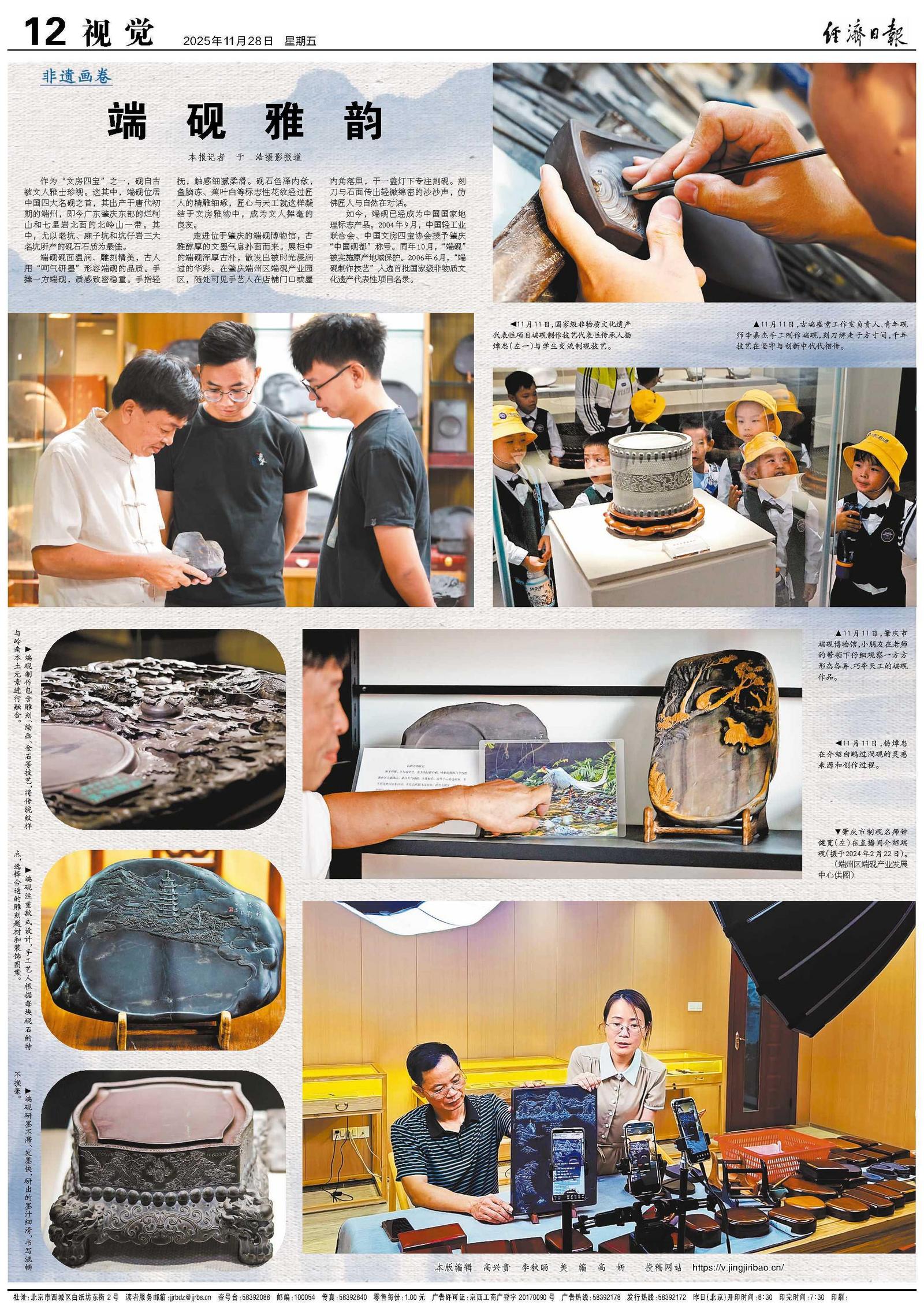 走进位于肇庆的端砚博物馆,古雅醇厚的文墨气息扑面而来。展柜中的端砚浑厚古朴,散发出被时光浸润过的华彩。在肇庆端州区端砚产业园区,随处可见手艺人在店铺门口或屋内角落里,于一盏灯下专注刻砚。刻刀与石面传出轻微绵密的沙沙声,仿佛匠人与自然在对话。
