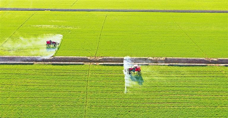 11月28日,安徽省安庆市宿松县省属农垦华阳河农场,工人驾驶打药机进行作业。入冬以来,当地针对不同苗情和墒情,对小麦实施化学除草、喷施苗肥等综合田管,助力小麦冬季分蘖、顺利过冬,为粮食增产丰收打好基础。李 龙摄(中经视觉)