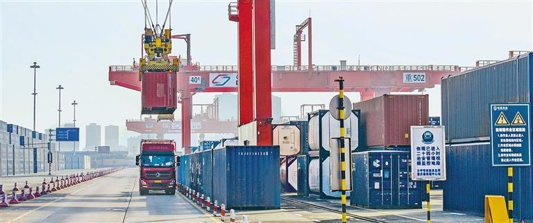 11月27日,位于重庆市沙坪坝区团结村的重庆铁路集装箱中心站,龙门吊正在吊装集装箱,该站是西部陆海新通道的重要铁路站点。前10个月,全国经西部陆海新通道进出口额达1.35万亿元,同比增长17.9%。