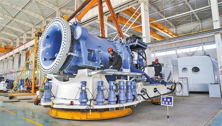在甘肃省酒泉经济技术开发区的甘肃省云风智慧风电设备有限公司装配车间,工作人员进行传动链吊装作业。近年来,甘肃省酒泉市依托丰富的风能资源,持续推动形成风电全产业链发展格局。如今,当地风电装备整体实现本地化配套,现已具备年产2000万千瓦风电装备的综合能力。 新华社记者 郎兵兵摄