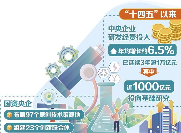 近年来,中央企业把科技创新作为首要任务,更大力度集聚创新要素、完善创新体系、激发创新活力。数据显示,“十四五”以来,中央企业研发经费投入年均增长约6.5%,已连续3年超1万亿元,其中近1000亿元投向基础研究。国资央企布局97个原创技术策源地,组建23个创新联合体,牵头组建479家产业科技创新战略联盟,与诸多高校、科研院所、国企民企形成了体系布局、协同攻坚、重点突破的强大合力。