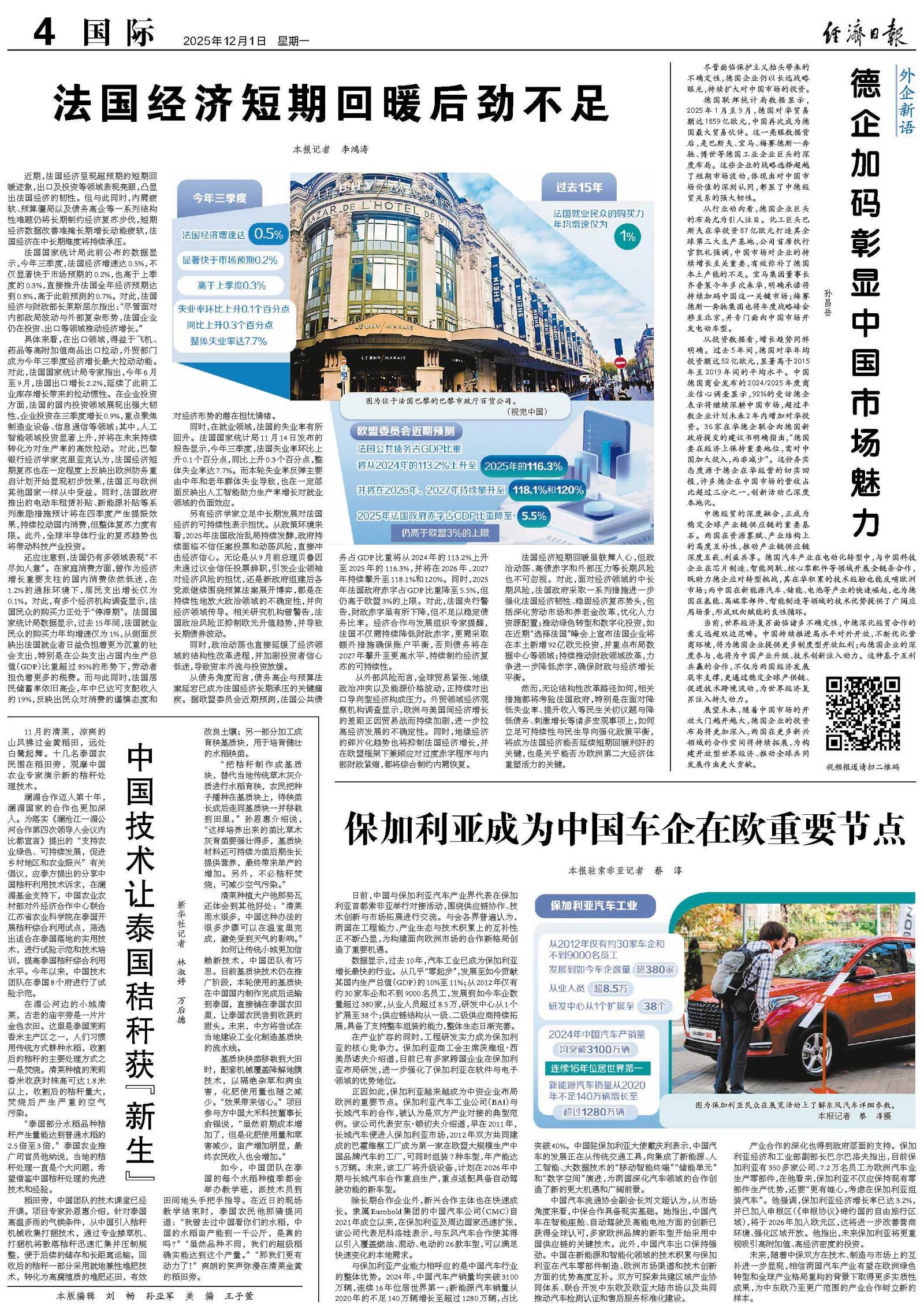 具体来看,在出口领域,得益于飞机、药品等高附加值商品出口拉动,外贸部门成为今年三季度经济增长最大拉动动能。对此,法国国家统计局专家指出,今年6月至9月,法国出口增长2.2%,延续了此前工业库存增长带来的拉动惯性。在企业投资方面,法国的国内投资领域展现出强大韧性,企业投资在三季度增长0.9%,重点聚焦制造业设备、信息通信等领域;其中,人工智能领域投资显著上升,并将在未来持续转化为对生产率的高效拉动。对此,巴黎银行经济学家克里亚克认为,法国经济短期复苏也在一定程度上反映出欧洲防务重启计划开始显现初步效果,法国正与欧洲其他国家一样从中受益。同时,法国政府推出的电动车租赁补贴、新能源补贴等系列激励措施预计将在四季度产生提振效果,持续拉动国内消费,但整体复苏力度有限。此外,全球半导体行业的复苏趋势也将带动科技产业投资。