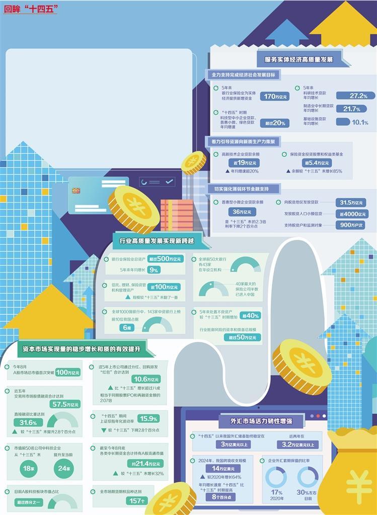 扎实做好金融“五篇大文章”,金融业精准支持重点领域。“十四五”时期,金融业有力支持国家重大战略、经济社会发展的重点领域和薄弱环节,特别是提升了金融服务科技创新能力,满足科技型企业不同生命周期阶段的融资需求。5年来,科技型中小企业贷款、普惠小微、绿色贷款年均增速超过20%。资本市场服务科技创新跑出加速度,市场含“科”量进一步提升,目前A股科技板块市值占比超过四分之一。