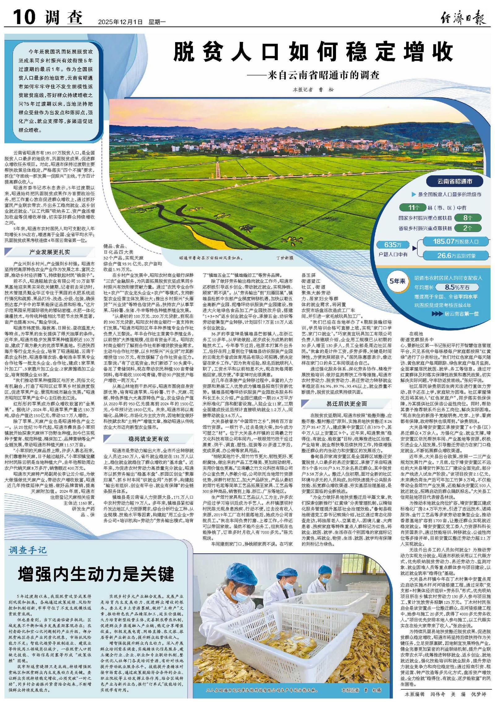 昭通市委书记苏永忠表示,5年过渡期以来,昭通始终把巩固脱贫成果作为首要政治任务,把工作重心放在促进群众增收上,通过抓好富民产业联农带农、外出务工稳岗就业、返乡创业就近就业、“以工代赈”吸纳务工、资产盘活增加收益等促增收举措,切实答好群众持续增收之问。