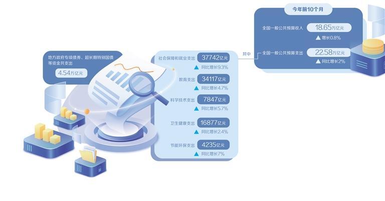统计显示,今年前10个月,全国一般公共预算收入18.65万亿元,增长0.8%,累计增幅稳步回升;全国一般公共预算支出22.58万亿元,同比增长2%,重点领域支出得到有力保障。各级财政持续加快债券资金使用,地方政府专项债券、超长期特别国债等资金共支出4.54万亿元,向经济发展注入强劲动力。