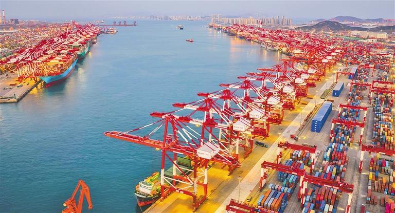 12月1日,山东港口青岛港前湾集装箱码头,货物运转繁忙有序。今年以来,青岛港加大集装箱外贸航线拓展力度,协同全球主要船公司将优质运力向新兴市场倾斜,开通重点方向航线17条。目前,青岛港外贸航线近240条,联通180多个国家和地区的700多个港口。