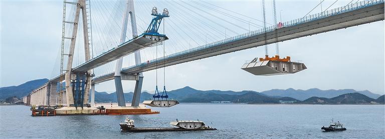 12月2日,中交二航局和中铁大桥局建设工人在浙江省宁波市域铁路象山港跨海大桥协同架设钢箱梁。该大桥建成后,将为沿线地区经济发展注入新动能。