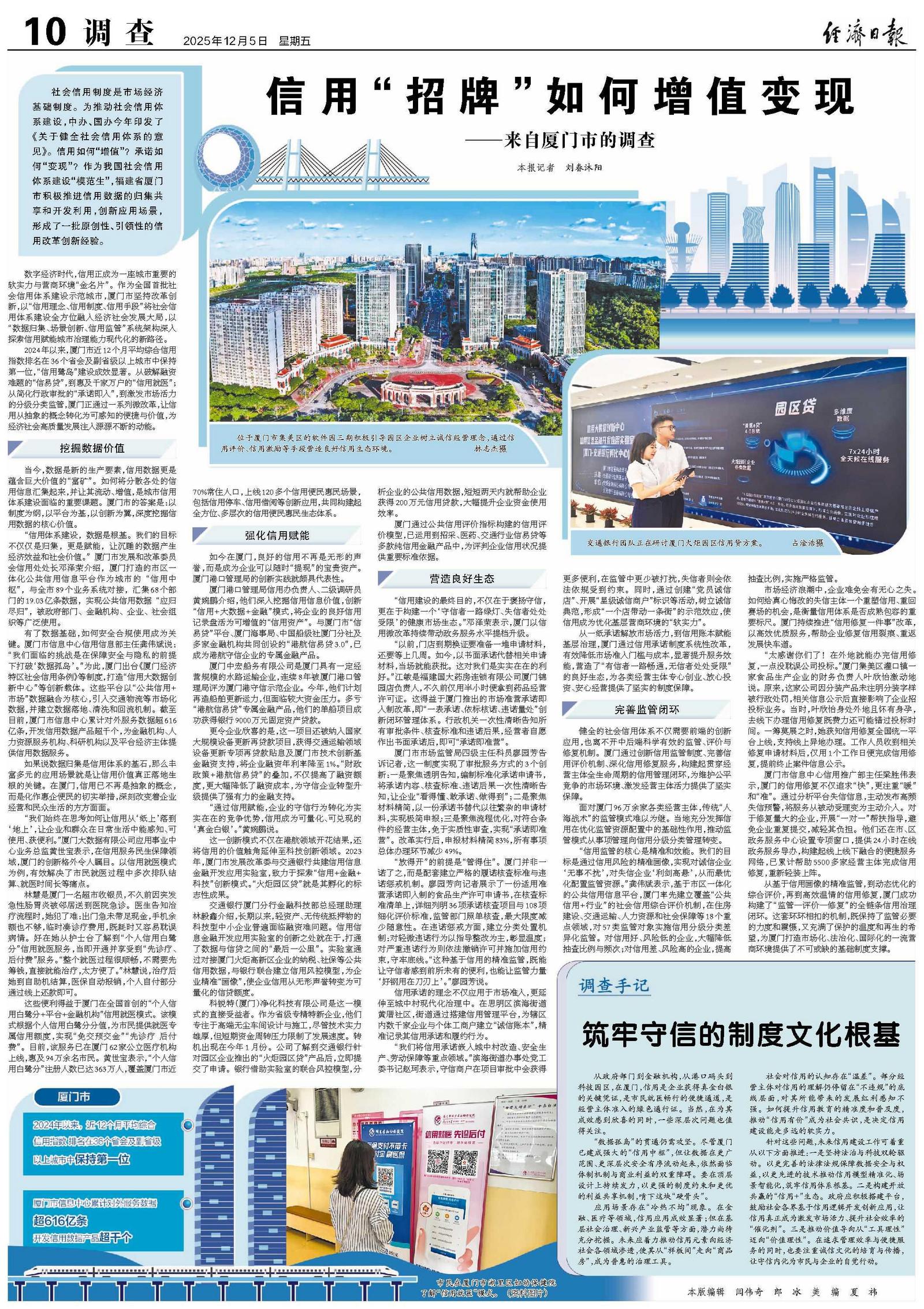 2024年以来,厦门市近12个月平均综合信用指数排名在36个省会及副省级以上城市中保持第一位,“信用鹭岛”建设成效显著。从破解融资难题的“信易贷”,到惠及千家万户的“信用就医”;从简化行政审批的“承诺即入”,到激发市场活力的分级分类监管,厦门正通过一系列微改革,让信用从抽象的概念转化为可感知的便捷与价值,为经济社会高质量发展注入源源不断的动能。