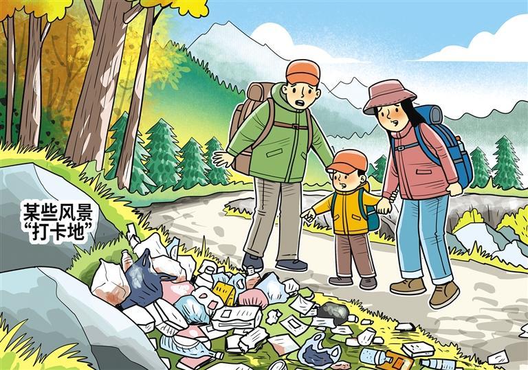 塑料水瓶、一次性餐盒、废旧帐篷……近日,在一些小众景点或徒步路线附近的山林间、河道里,不少垃圾肆意散落。据游客反映,一些成熟的徒步路线,沿途也时常见到各种垃圾。部分游客或户外爱好者环保意识不够强,加上小众景点没有明确的管理机构和责任主体,缺少垃圾桶等基础设施和处理力量,垃圾难以被及时清运。这不仅影响游客体验,还会引发一系列生态环境问题,甚至埋下安全隐患。对此,属地政府一方面应对小众景点资源进行梳理和评估,加强配套设施建设,对于尚无明确管理主体的景点,牵头建立协同治理机制,与文旅、自然资源、水务、生态环境等部门交叉联动、形成合力;另一方面也需健全约束与惩罚机制,加大对游客不当行为的处罚力度,筑牢生态保护防线。(时 锋)