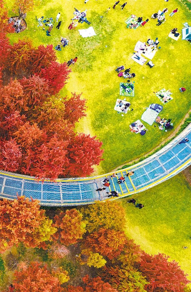 12月7日,武汉市江汉区常青人才公园,游客在休闲赏景。该公园是武汉首座5G智慧公园,以智慧化设施、多功能活动空间为特色。马二虎摄(中经视觉)
