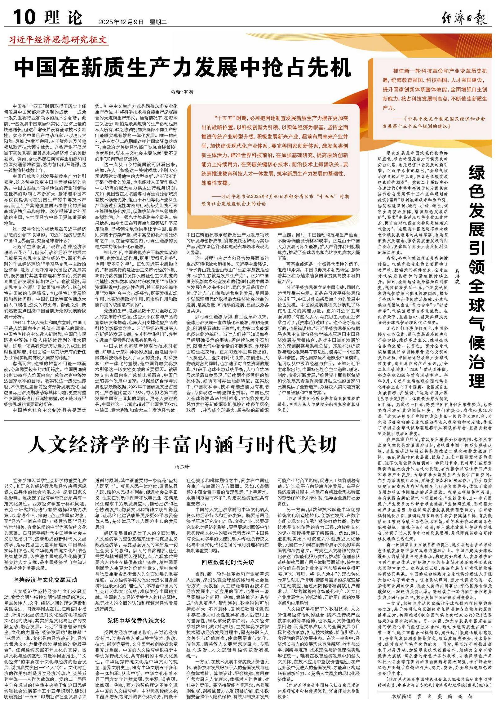 习近平经济思想立足中国实践,同时也为世界带来启示。正是在习近平经济思想的指引下,中国才能在新质生产力的发展中抢占先机。中国的发展进程充分展现了马克思主义的真理力量。正如习近平主席强调的:“有些人认为,马克思主义政治经济学过时了,《资本论》过时了。这个论断是武断的,也是错误的。”习近平经济思想坚持把马克思主义政治经济学基本原理同中国经济发展实际相结合,是对中国当前发展阶段的深刻洞察与系统总结。其基本分析逻辑与理论框架具有普适性,值得每一个国家学习借鉴。其他国家虽不能照搬中国模式,但可以从中汲取经验与启示。正如习近平主席指出的,中国特色社会主义道路、理论、制度、文化不断发展,“给世界上那些既希望加快发展又希望保持自身独立性的国家和民族提供了全新选择,为解决人类问题贡献了中国智慧和中国方案”。