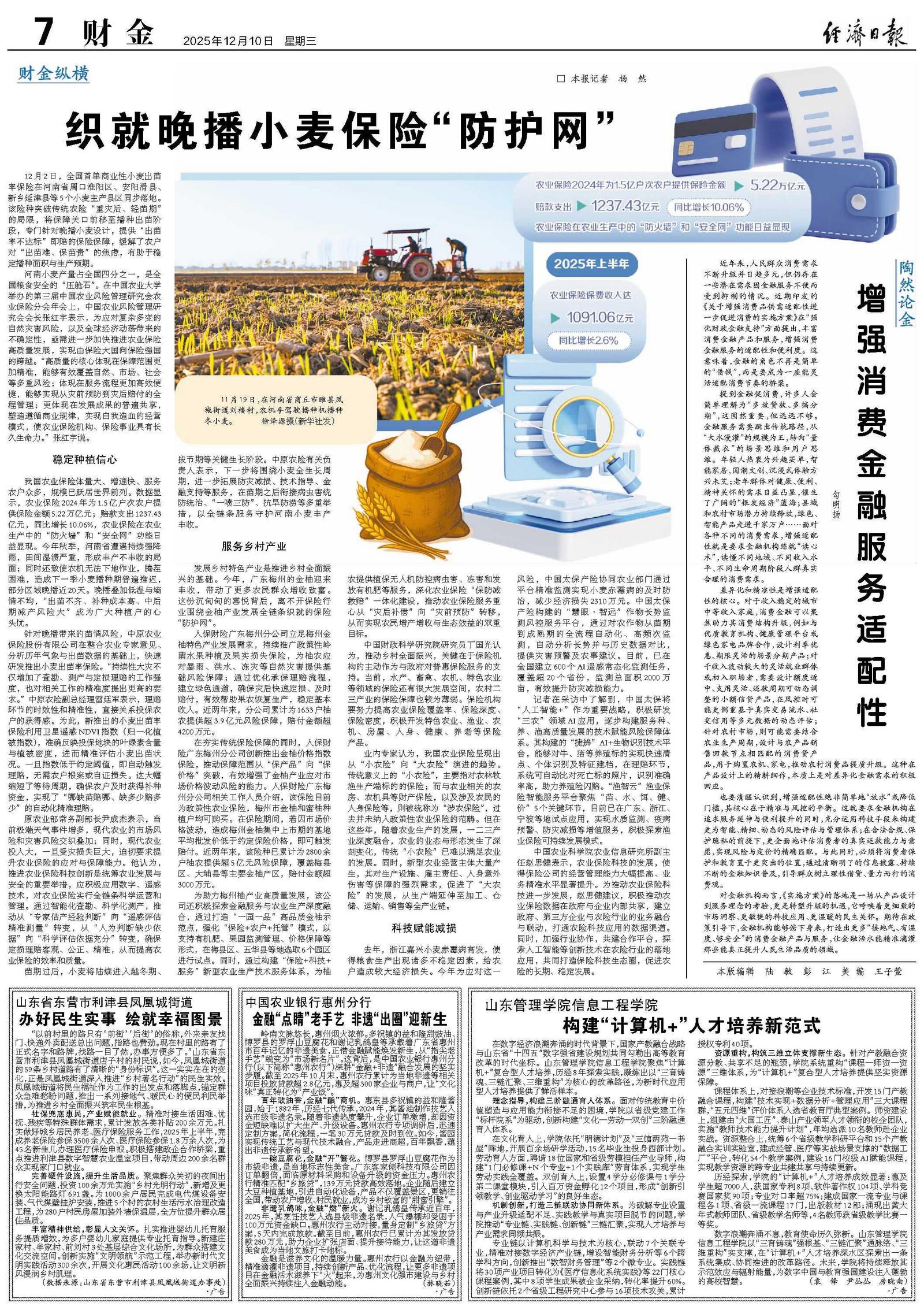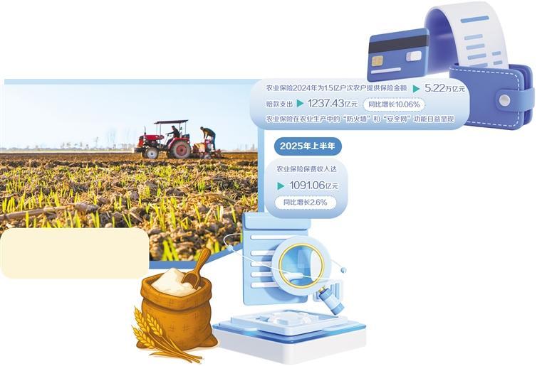 我国农业保险体量大、增速快、服务农户众多,规模已跃居世界前列。数据显示,农业保险2024年为1.5亿户次农户提供保险金额5.22万亿元;赔款支出1237.43亿元,同比增长10.06%,农业保险在农业生产中的“防火墙”和“安全网”功能日益显现。今年秋季,河南省遭遇持续强降雨,田间湿渍严重,形成丰产不丰收的局面;同时还致使农机无法下地作业,腾茬困难,造成下一季小麦播种期普遍推迟,部分区域晚播近20天。晚播叠加低温与墒情不均,“出苗不齐、补种成本高、中后期减产风险大”成为广大种植户的心头忧。