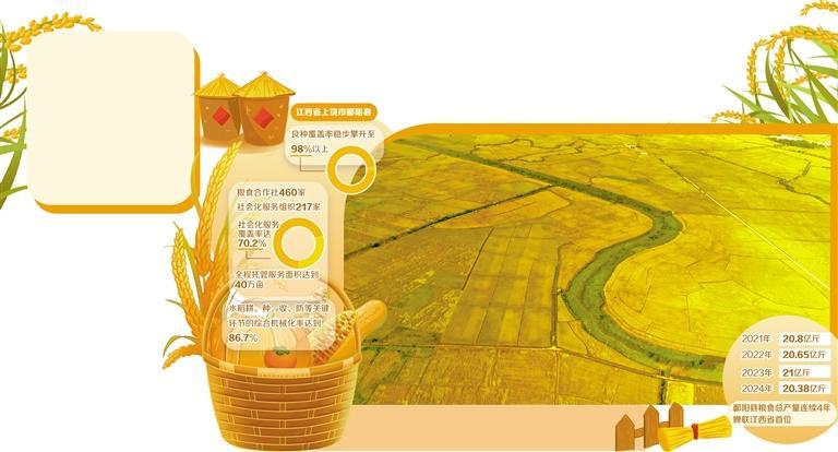 2021年20.8亿斤、2022年20.65亿斤、2023年21亿斤、2024年20.38亿斤,鄱阳县粮食总产量连续4年蝉联江西省首位……农民更愿意种田了,“江西粮仓”自然更稳了。