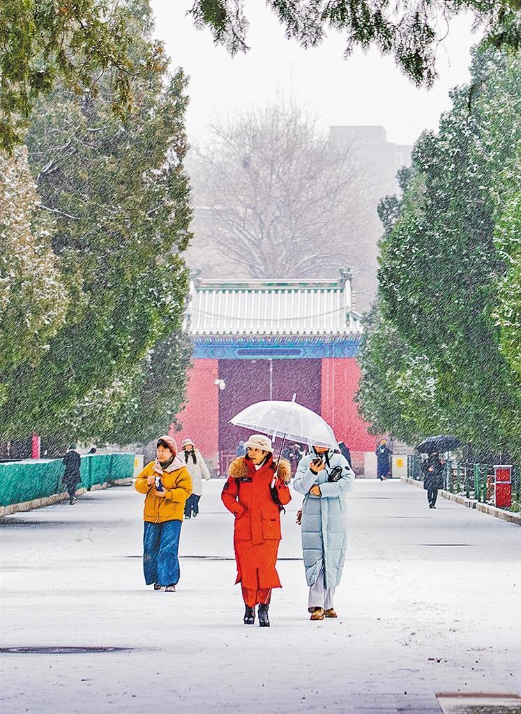 12月12日,北京迎来今冬首场明显降雪,这是游客当日在北京地坛公园赏雪拍照。本报记者 赵 晶摄
