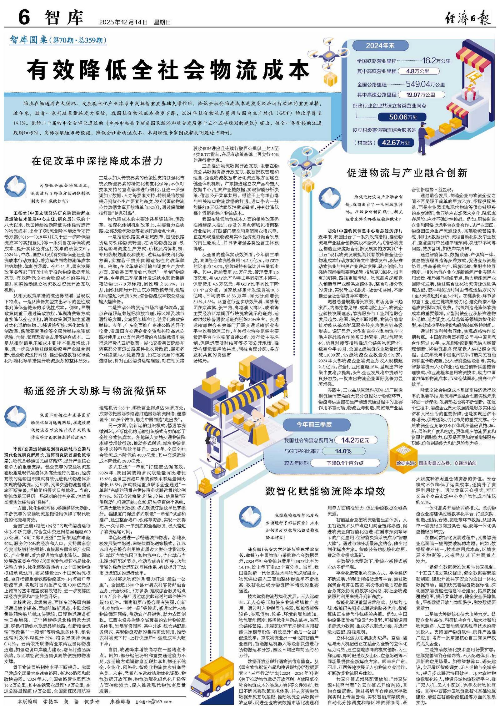 物流在畅通国内大循环、发展现代化产业体系中发挥着重要基础支撑作用,降低全社会物流成本是提高经济运行效率的重要举措。近年来,随着一系列政策措施发力显效,我国社会物流成本稳步下降,2024年社会物流总费用与国内生产总值(GDP)的比率降至14.1%。党的二十届四中全会审议通过的《中共中央关于制定国民经济和社会发展第十五个五年规划的建议》提出,健全一体衔接的流通规则和标准,高标准联通市场设施,降低全社会物流成本。本期特邀专家围绕相关问题进行研讨。