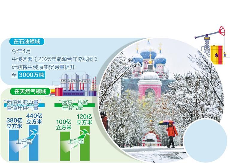 中俄能源合作是两国务实合作的重要基石。近日,以“强化中俄高水平战略对接,持续巩固全面能源合作伙伴关系”为主题的第七届中俄能源商务论坛举行。俄罗斯总统普京在向论坛发来的贺信中表示,俄中全面战略协作伙伴关系持续向前发展,能源是双方务实合作的关键领域之一。俄中两国正在燃料能源领域推进多个对两国经济与科技发展具有重大意义的大规模联合项目。以天然气为例,中俄东线天然气管道——“西伯利亚力量1号”自2019年通气以来,截至2024年11月,已累计输气超过780亿立方米。2025年实现满负荷运行后,年输气量将达到380亿立方米,可满足约1.3亿户家庭的用气需求。俄罗斯天然气工业股份公司表示,俄罗斯天然气,尤其是该公司提供的管道天然气,在保障中国天然气供应稳定方面发挥着重要作用。“西伯利亚力量”管道日供气量已提前达到合同规定的最高水平。