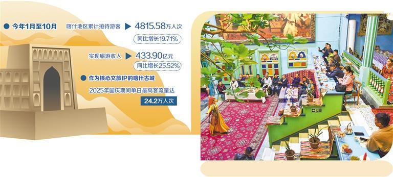 晨光熹微,第一缕阳光洒向新疆喀什古城,老街巷在馕坑的袅袅炊烟和铜器的叮当作响声中缓缓苏醒,千年风情一如往昔;夜幕降临,璀璨的灯火点亮街巷,“网红”打卡点与美食“巴扎”聚拢人间烟火。数据显示,今年1月至10月,喀什地区累计接待游客4815.58万人次,同比增长19.71%;实现旅游收入433.90亿元,同比增长25.52%。作为核心文旅IP的喀什古城持续保持高热度,国庆期间单日最高客流量达24.2万人次。
