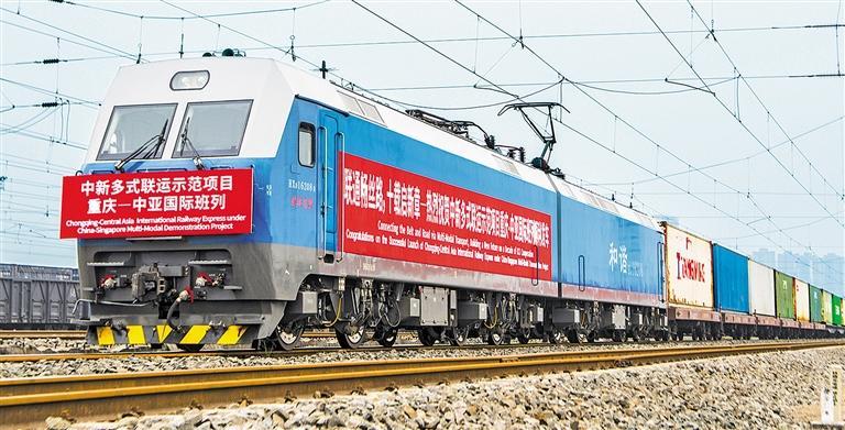 十二月十五日,中新多式联运示范项目重庆—中亚、重庆—东南亚国际班列实现双向发车,将有机衔接中欧班列和陆海新通道。图为重庆—中亚国际班列在重庆鱼嘴站等待发车。新华社记者 唐 奕摄