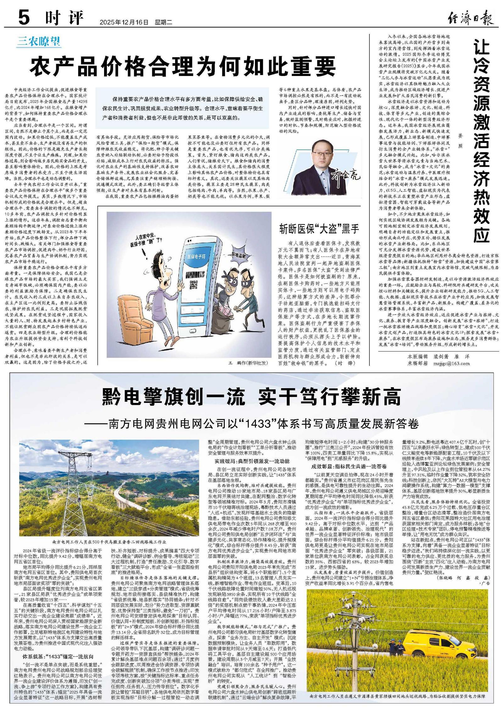 从发展看,质量效益同步提升。价值创造上,贵州电网公司建立“1+N”亏损治理体系,净资产收益率同比增长3.91个百分点,省内售电量增长9.2%,黔电送粤达407.4亿千瓦时,创“十四五”以来最好水平;绿色转型上,建成500千伏仁义输变电等新能源配套工程,10千伏及以下线损率连续8年下降,六盘水羊场近零碳示范区经验入选博鳌亚洲论坛绿色发展案例;安全管理上,中风险及以上作业到位管控率从64.27%升至97.31%,临时作业量下降32%,筑牢安全防线;科技创新上,依托“大瓦特”AI大模型与电力鸿蒙操作系统,构建“算力—数据—模型”支撑体系,基层创新落地效率提升30%,彰显新质生产力培育成效。