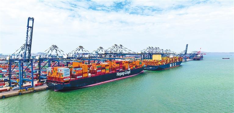 近年来,广东省广州港持续深耕全球航线服务网络建设,着力优化国际供应链布局,全力保障产业链畅通运转。图为广州港南沙港区大型货轮有序装卸货物,一派繁忙景象。