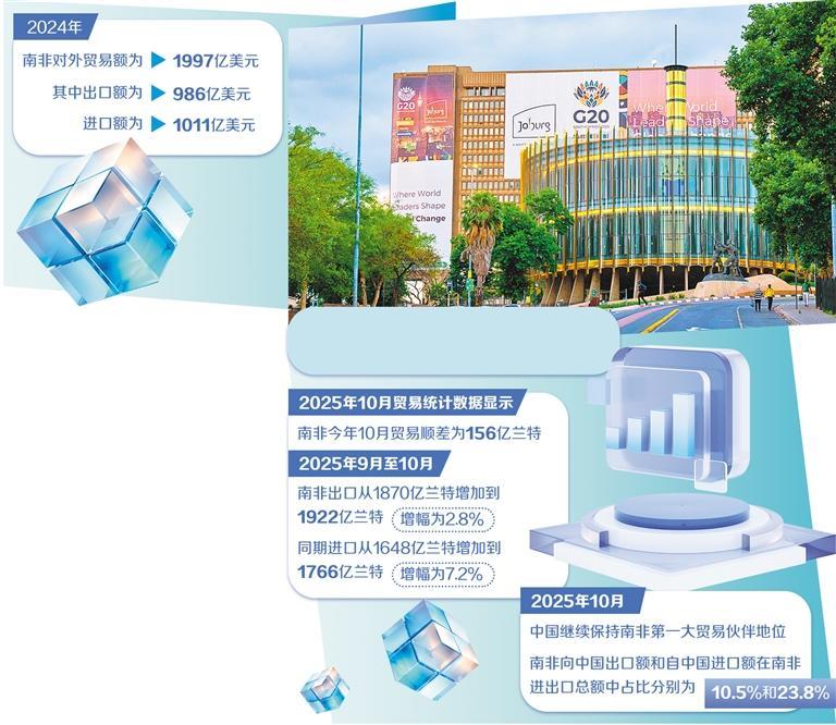 南非税务总局(SARS)11月28日发布的2025年10月贸易统计数据显示,南非今年10月贸易顺差为156亿兰特。2025年9月至10月,南非出口从1870亿兰特增加到1922亿兰特,增幅为2.8%,同期进口从1648亿兰特增加到1766亿兰特,增幅为7.2%。数据显示,2025年10月,中国继续保持南非第一大贸易伙伴地位,南非向中国出口额和自中国进口额在南非进出口总额中的占比分别为10.5%和23.8%,南中贸易额在南非对外贸易额中的占比大幅领先于南非与其他贸易伙伴。